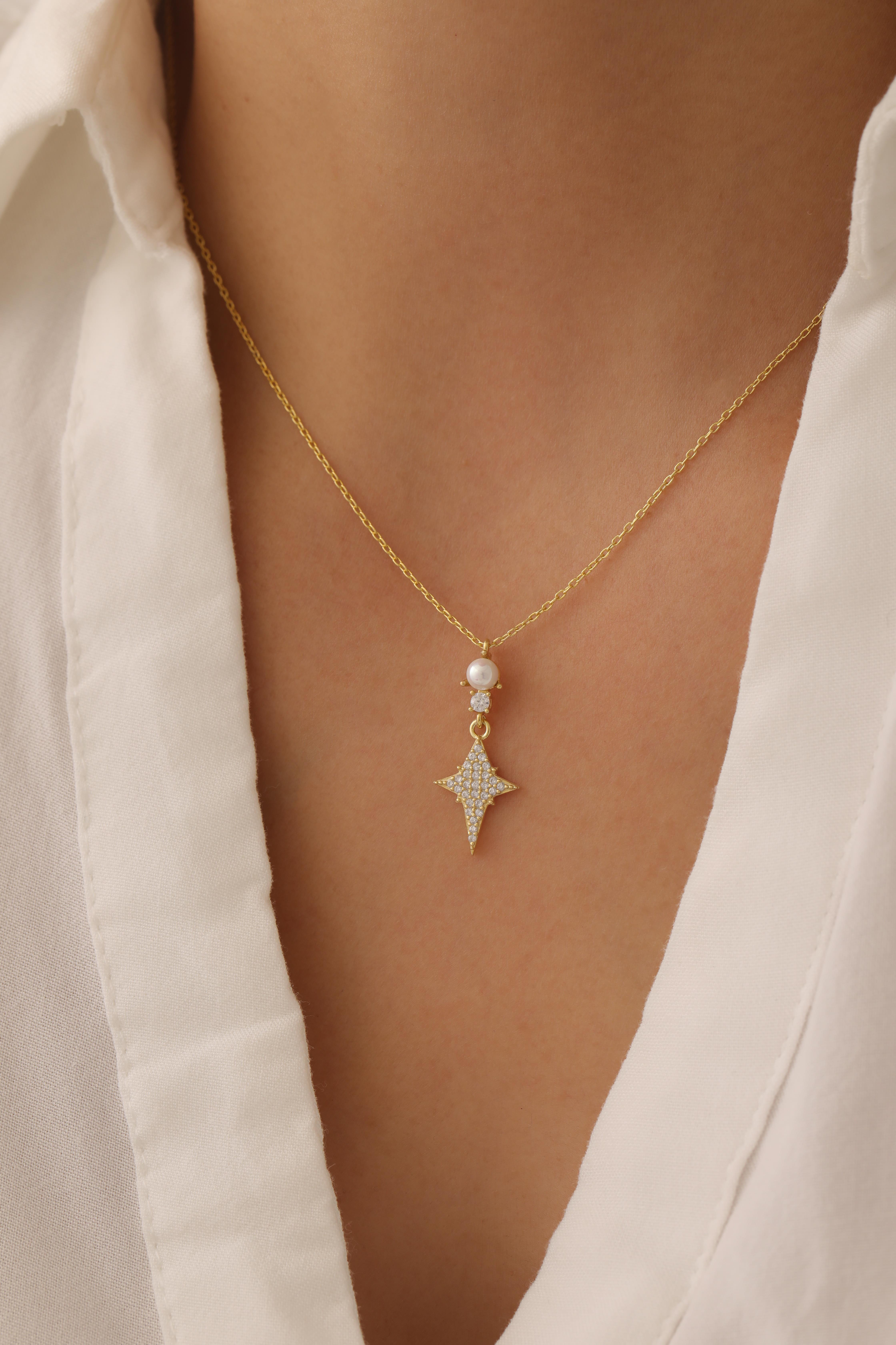 İnci Detaylı Taşlı Kutup Yıldızı Kolye - 925 Ayar Gümüş